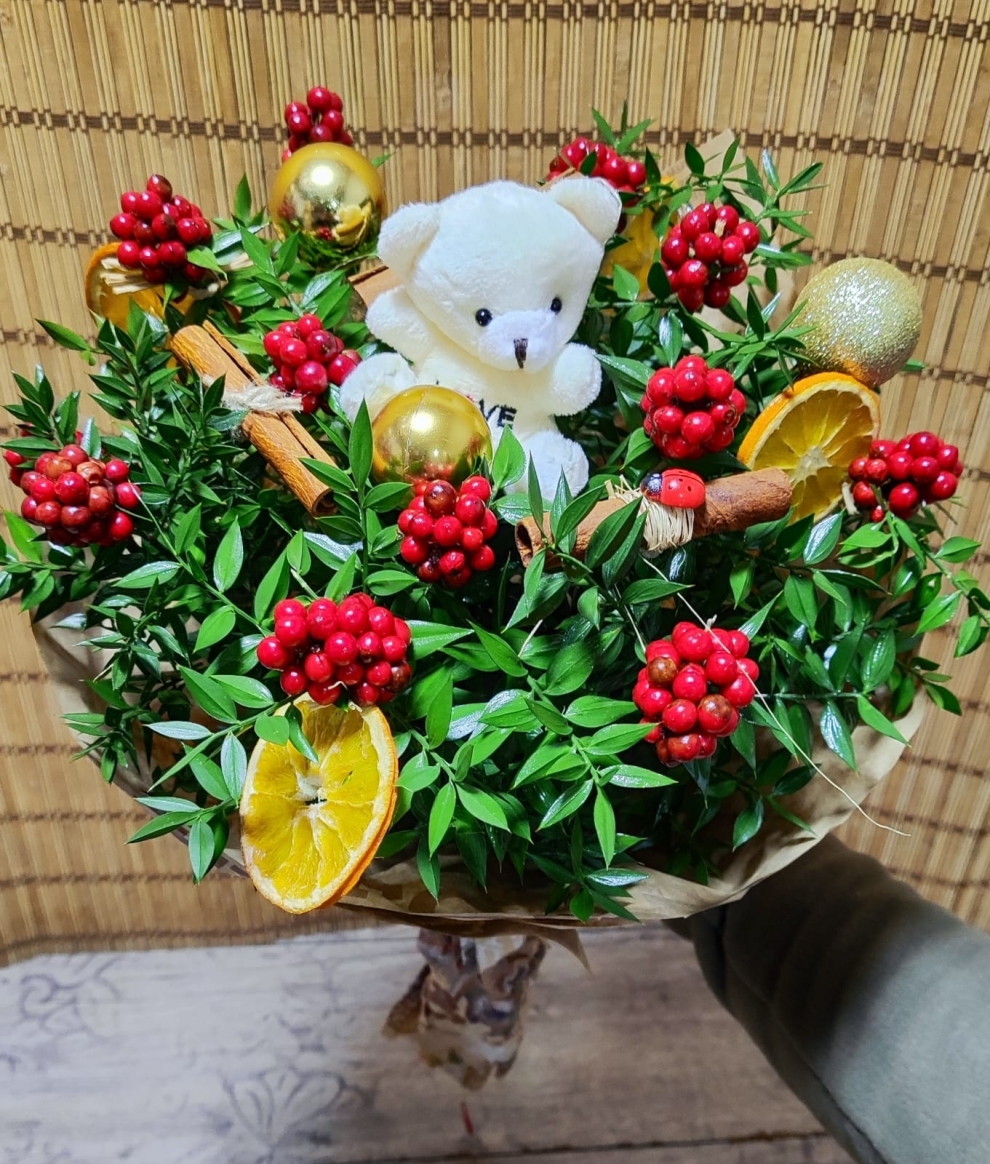 Sevdiklerinizin içini ısıtacak, her detayı özenle düşünülmüş sıcacık bir hediye. Canlı kokinalar, yılbaşı topları, mis kokulu tarçınlar, kurutulmuş portakal kabuğu ve sevimli ayıcık, kokina buketinin şıklığını tamamlıyor. '' İçimden geldi'' hediyesi için mükemmel bir tercih.