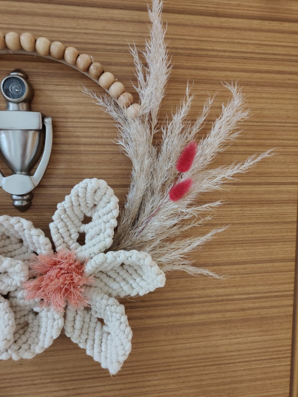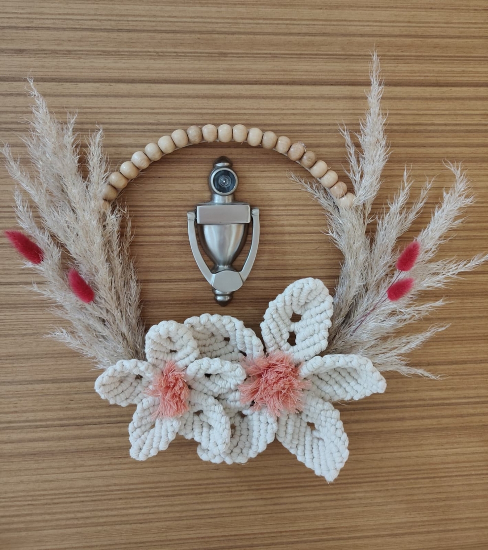 Makrome tekniğiyle özenle hazırlanmış, çiçek ve doğal otlarla süslenmiş kapı ve duvar süsü. Bebek odası süslemesi için de uygundur.