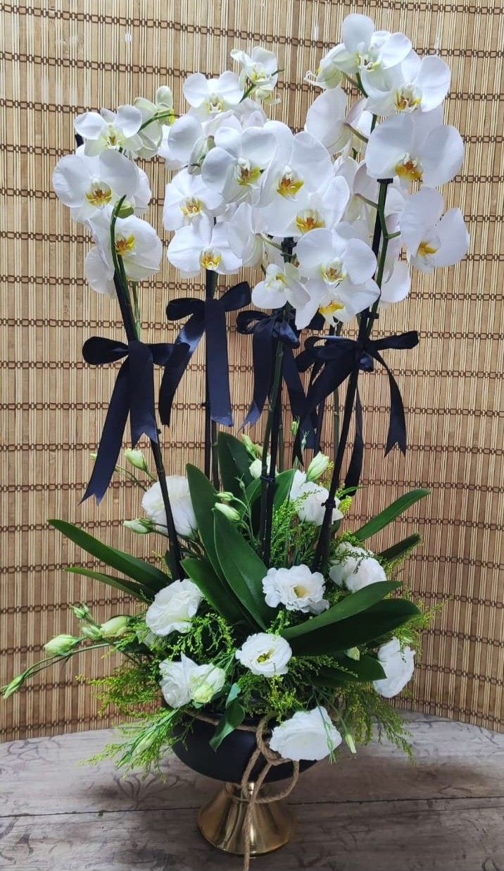 Lüks siyah vazoda çok dallı beyaz orkide. Beyaz orkide ve lisyantus un saf zarafeti, siyah ve altın renklerin asil ihtişamıyla birleşiyor. 6 dal ile zenginleştirilmiş bu orkide aranjmanı bulunduğu ortama anında ağırlık ve prestij katmaktadır. Siyah vazo ve altın rengi ayak detaylı bu seçim en özel günleriniz için kusursuz bir seçimdir.