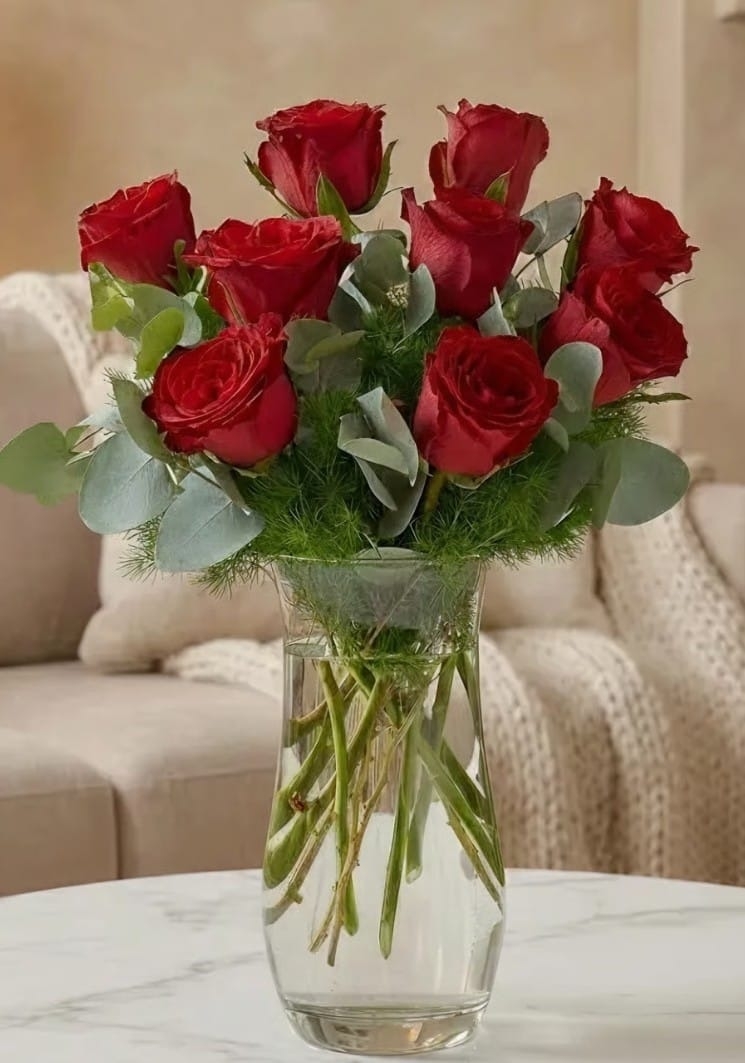 Derin duyguları ifade etmenin en güzel yolu. Taptaze kırmızı güller. Okaliptüs yapraklarının ferahlığıyla şık bir cam vazoda tasarlandı. Sevdiğinizin gününe unutulmaz bir zarafet katın.